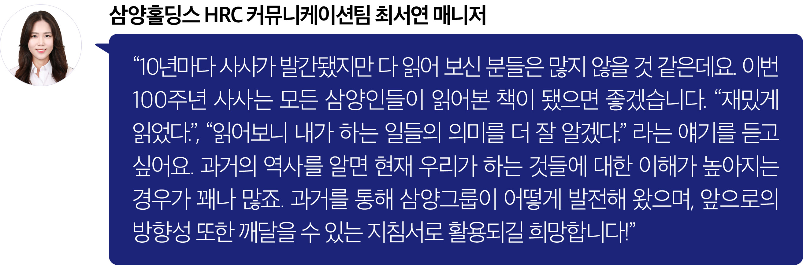100주년 사사 속에서 삼양인들이 그려갈 새로운 100년의 비전을 발견하길 바라며,